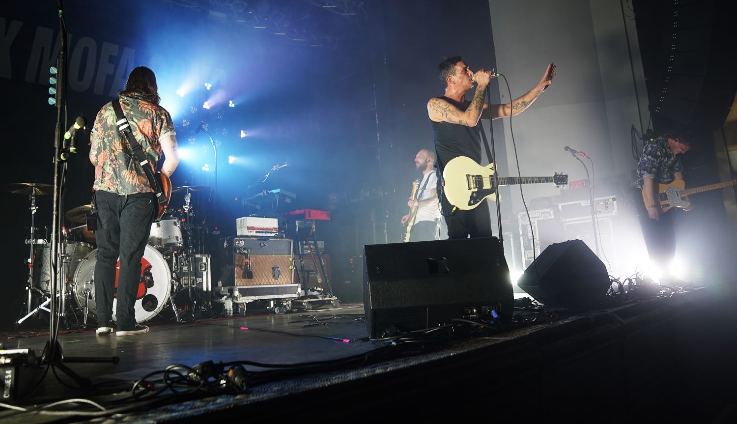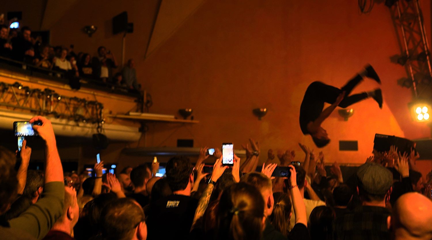 Die Kälte, die die Gäste von draußen in den Saal mitgebracht haben, vertreiben zunächst Alex Mofa Gang. Die wirken zunächst wie die Toten Hosen für Arme, entpuppen sich aber in der knappen Dreiviertelstunde ihrer Spielzeit als punkige Poprocker mit Mitgröl-Potential und Botschaft. Im „Mann von gestern“ appellieren sie an die Gleichstellungsbereitschaft der Menschen und später an die Fans, sich gegen Rassismus und Homophobie einzusetzen und für die Liebe zu hüpfen. Dann stellt sich Leadsänger Sascha Hörold inmitten des Publikums auf einen Drum-Koffer, den einige kräftige Fans in die Höhe stemmen – als Rampe, von der Hörold mit einem wagemutigen Salto zum Crowdsurfing hinunterspringt.