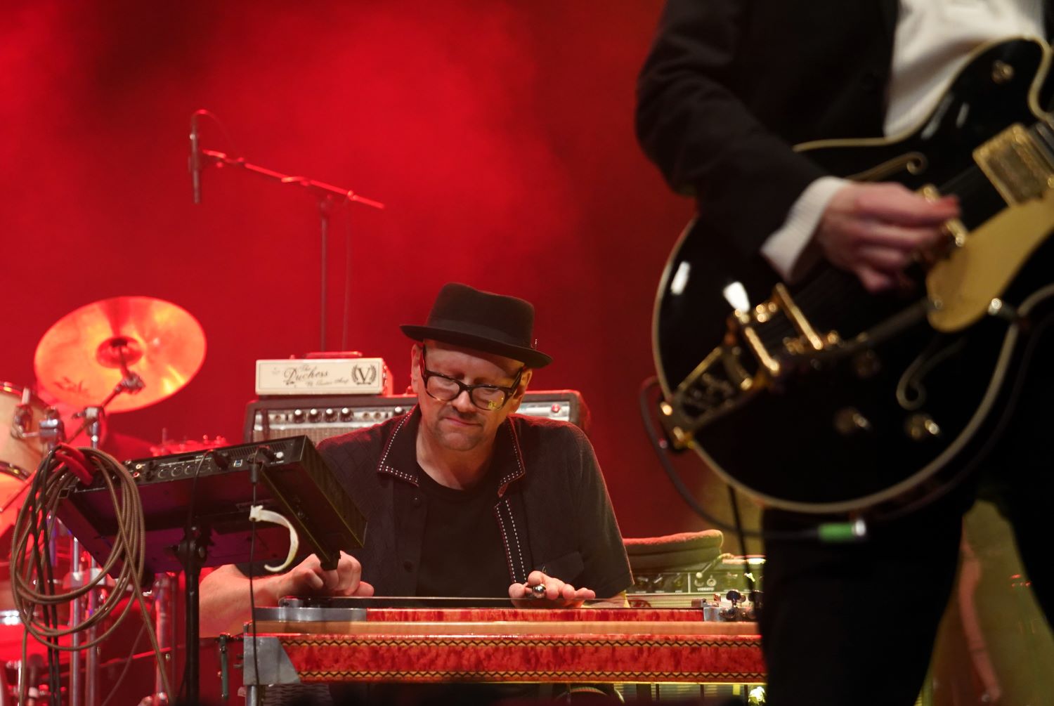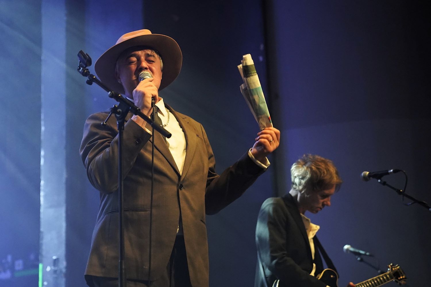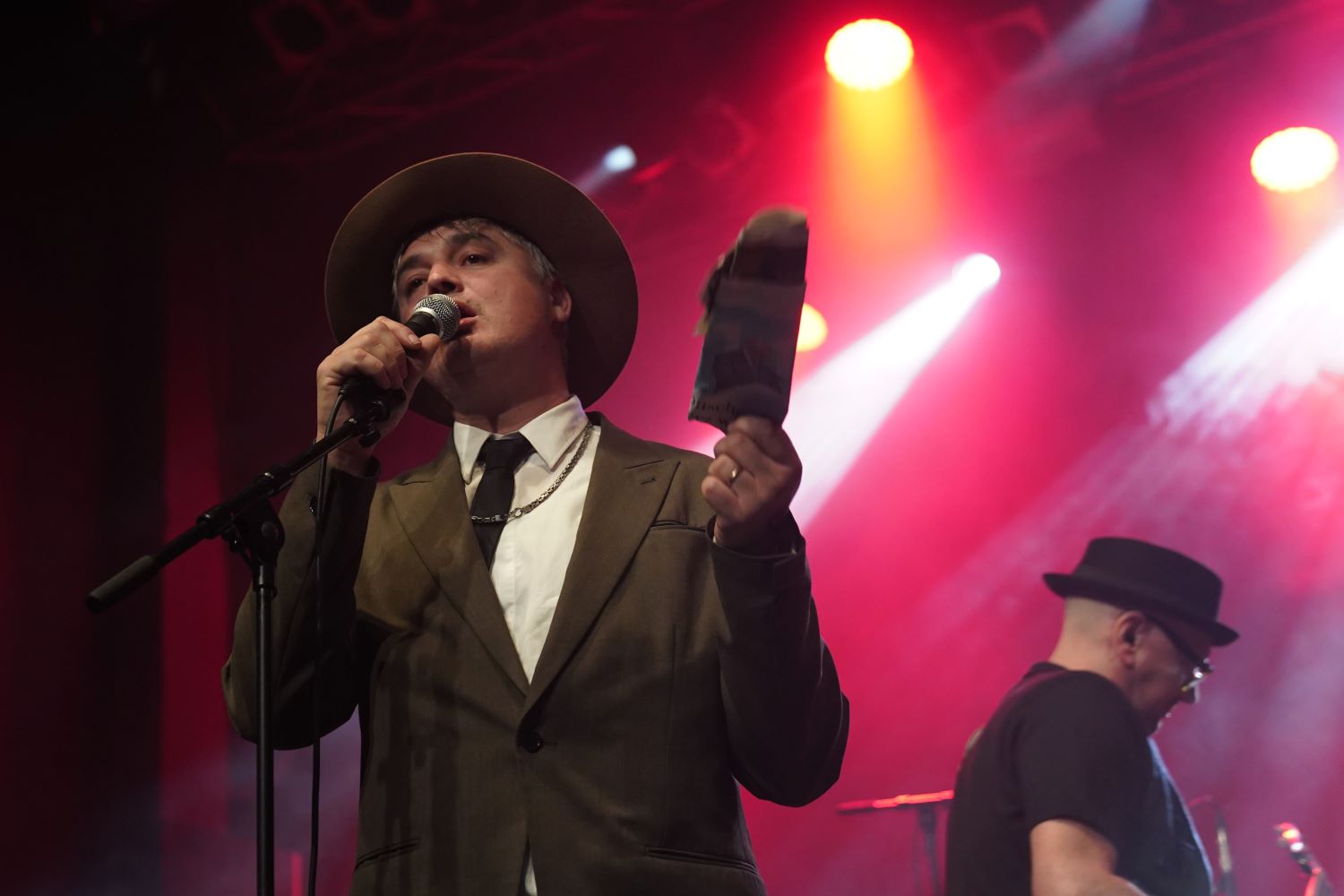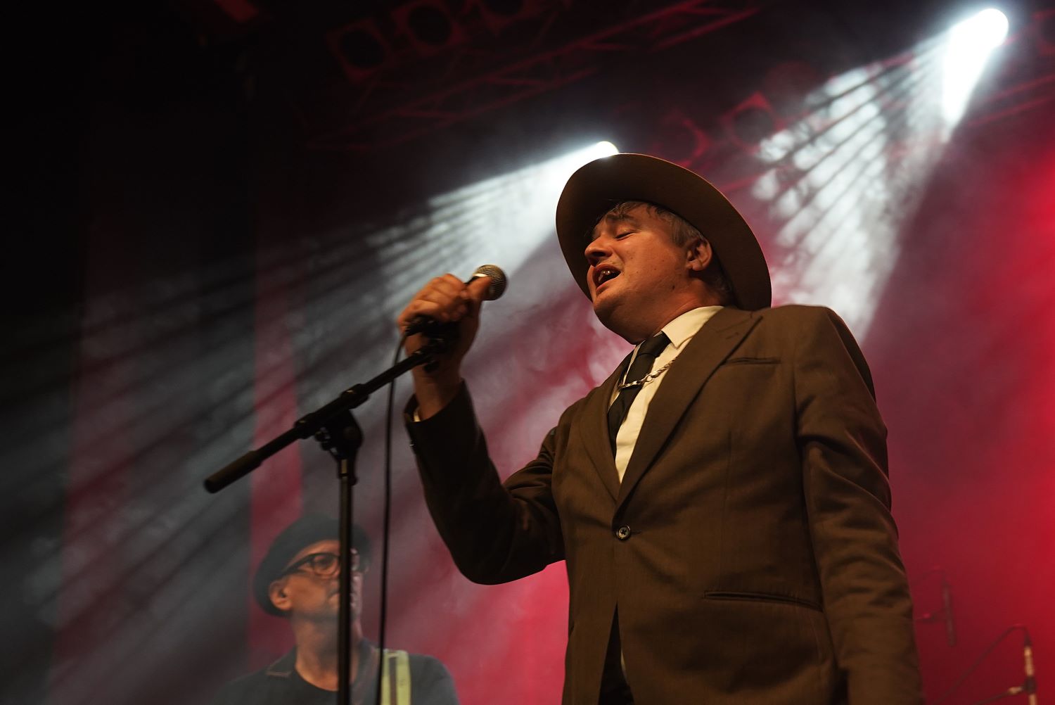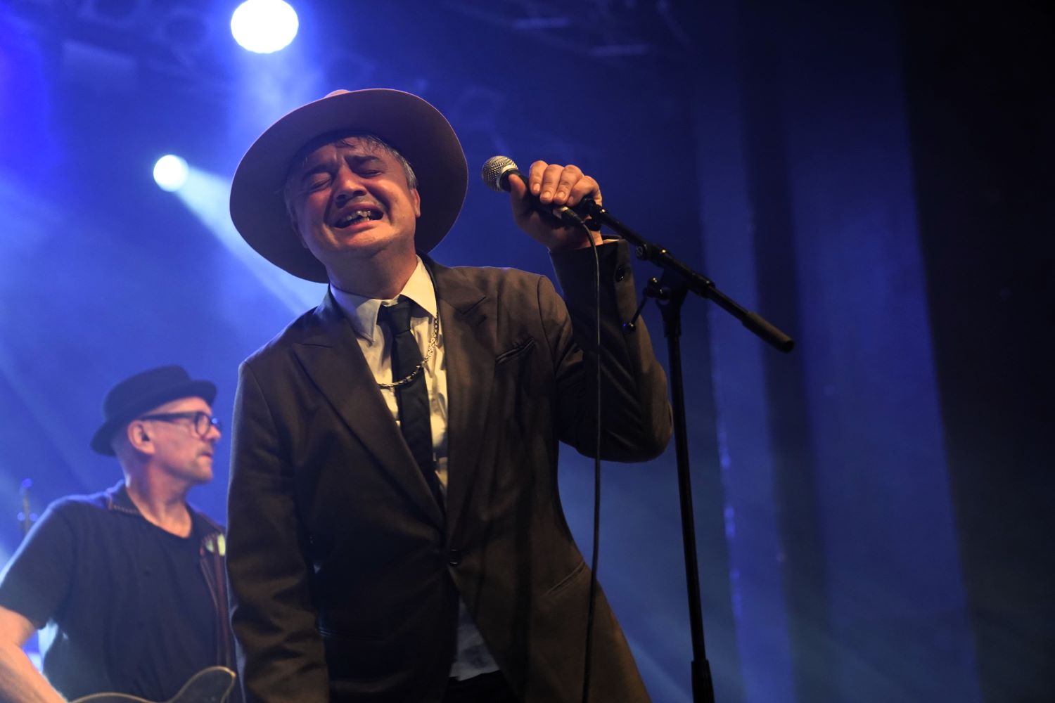 Doherty selbst pflegt die häuslich-familiäre Atmosphäre, wenn er nach der Umbaupause seinen Mantel an einen Garderobenständer hängt, später auch sein Jackett, die Krawatte und schließlich das weiße Hemd und den breitkrempigen Hut. Im Unterhemd wird deutlich, dass der spirrlige Heroin-Chic vergangener Tage längst Geschichte ist. Recht rundlich geworden feiert er das Leben: In dem melodietrunkenen „Calvados“ fließt der Apfelbrand in Strömen, das kantige „Stade Océan“ blickt aufs Meer und „Pots Of Gold“ richtet sich ans Töchterchen: „Hush my darling, no don’t you cry / Daddy’s trying to write you a lullaby so sweet / And if that lullaby is a hit / Dad can buy you loads of cool shit“. Wie auch „Ed Belly“ oder „Felt Better Alive“ leiden die neuen Stücke live unter dem Verzicht auf die hübschen Arrangements der Studioversionen mit Streichern und Bläsern. Immerhin kommt beim Libertines-Song „Baron’s Claw“ ein Trompeter hinzu. Der kryptische Text mag sich metaphorisch auf alte Sünden beziehen, Doherty stellt in Hannover jedoch einen Bezug zum verhassten Brexit her und fordert die Fans auf, ihre Hände zu Klauen zu formen. Der schunkelige Song taucht als „The Day The Baron Died“ auf dem aktuellen Soloalbum erneut auf. Deren entspannte Songs hatten sich bereits in der Zusammenarbeit mit Frédéric Lo angekündigt, wovon „The Fantasy Life Of Poetry & Crime“ zollt. Mit Mark Neary an der Pedal Steel Guitar, die auch den Walzer „I Am The Rain“ untermalt.