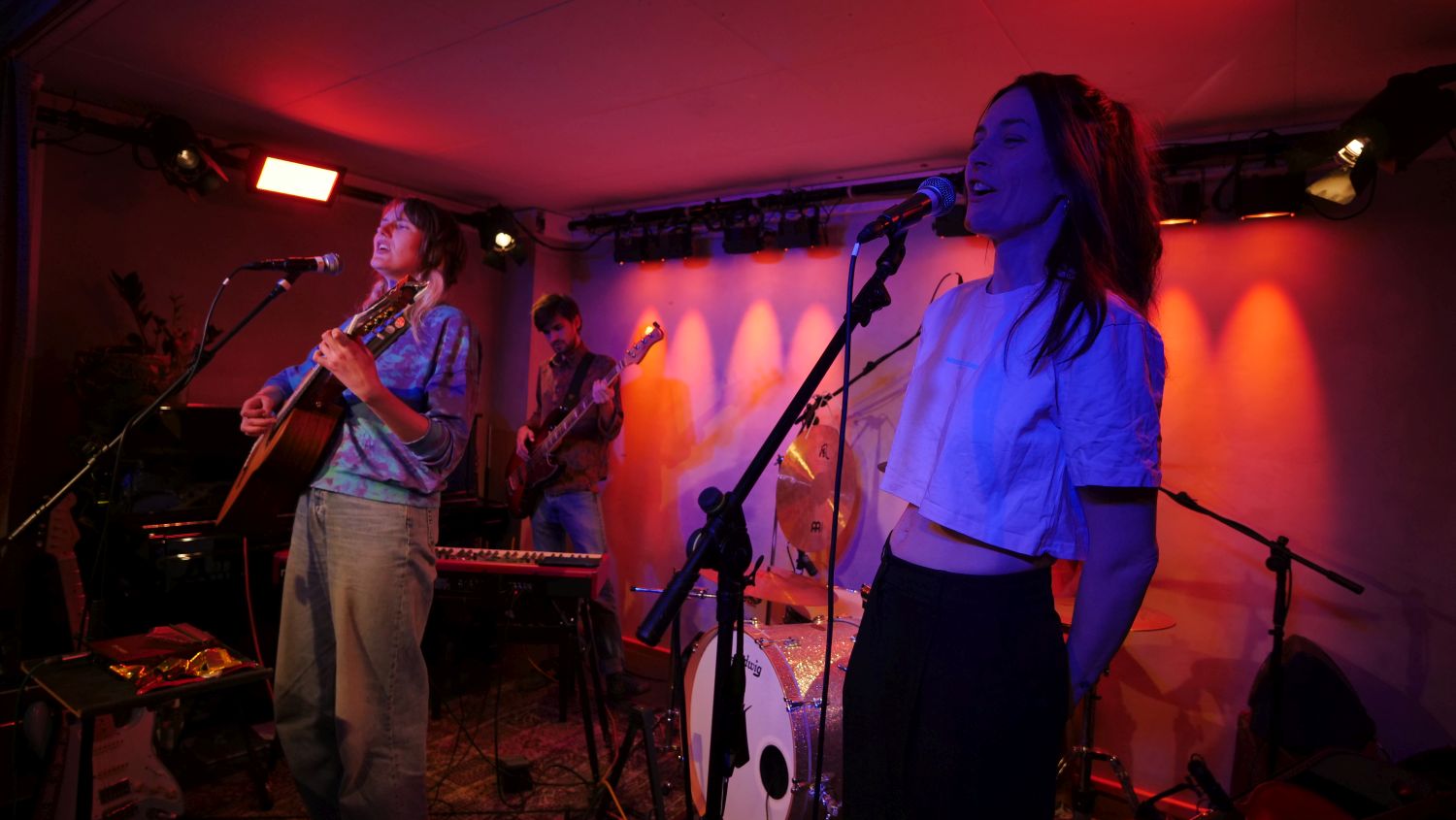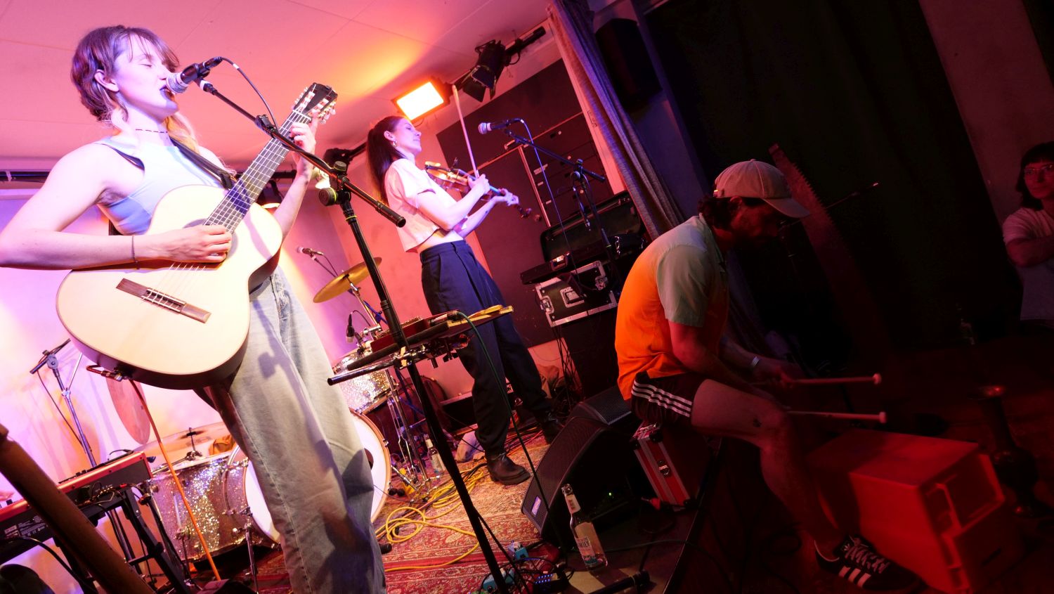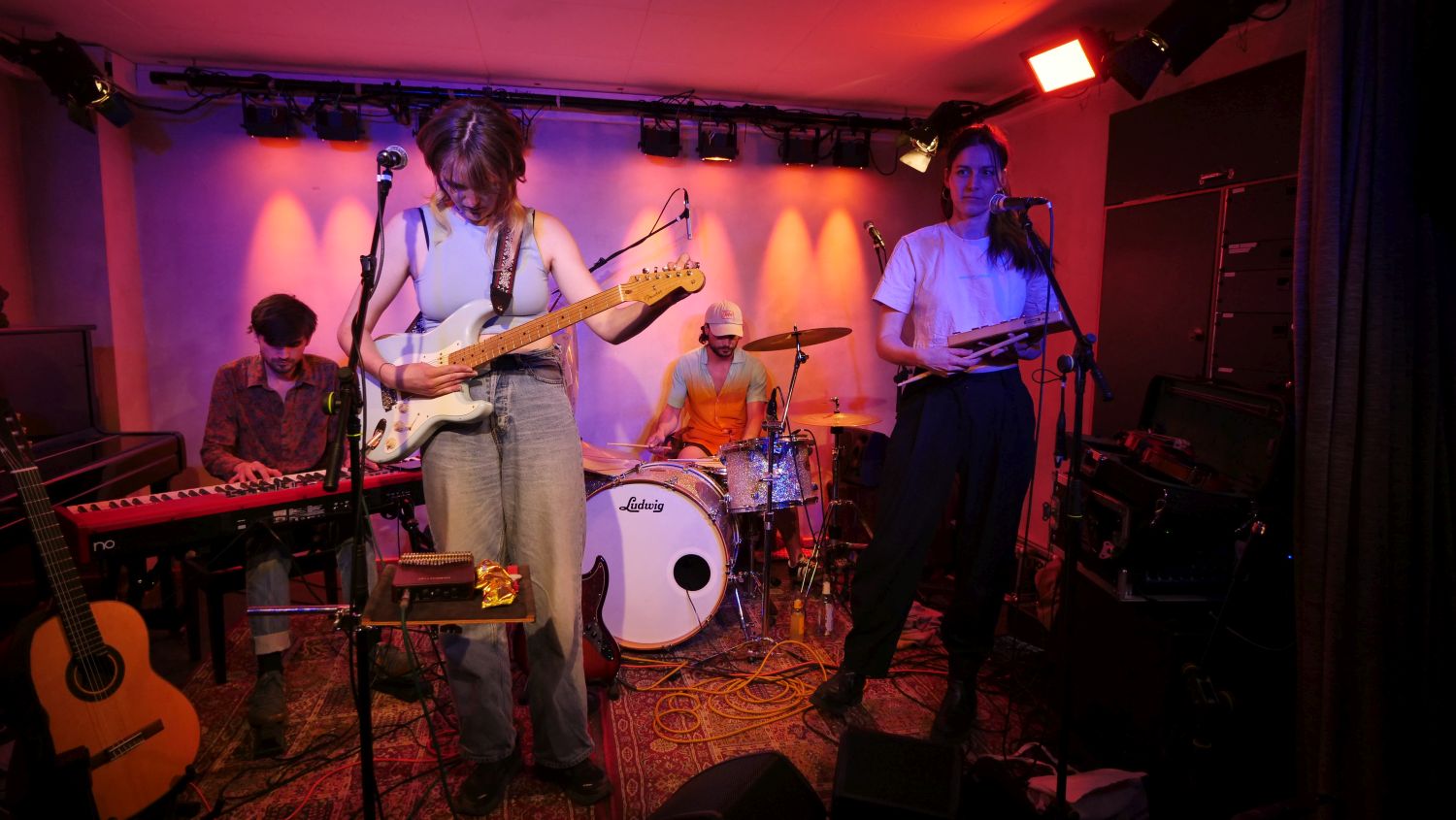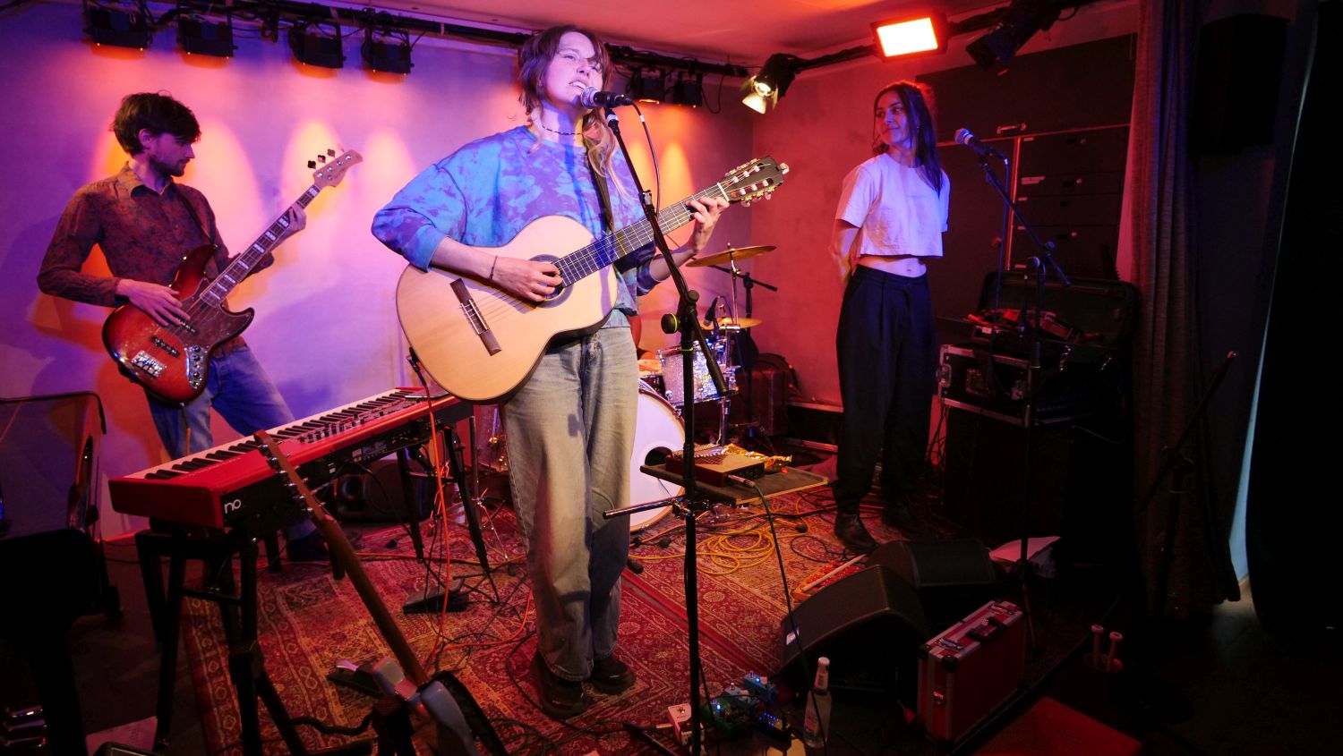 Das letzte Mal, als die Rosa Hoelger Bande (also neben Rosa selbst Judith Retzlik, Lewin Grosse und Tommy Schwarzbach) in Köln gewesen war, tobte noch die Pandemie, sodass sie ein Live-Konzert vor leerem Raum spielen musste. Das war zum Glück bei der Show in der Kölner Wohngemeinschaft, bei der Rosa & Co. ihre erste „richtige“ Banden-LP „Fuer immer Gummistiefel“ abfeierten, dann doch etwas anders. Die eigentlich entstuhlte Wohngemeinschaft war nämlich so gut gefüllt, dass die hinten im Raum stehenden Zuschauer darauf drängten, dass sich die weiter vorne stehenden hinsetzen sollten, damit sie auch etwas sehen konnten. „Wir arbeiten hier mit drei Verwarnungen“, meinte Rosa, bis sich dann auch die letzten Zuschauer, die noch vor der Bühne gestanden hatten, auf dem Boden Platz nahmen.