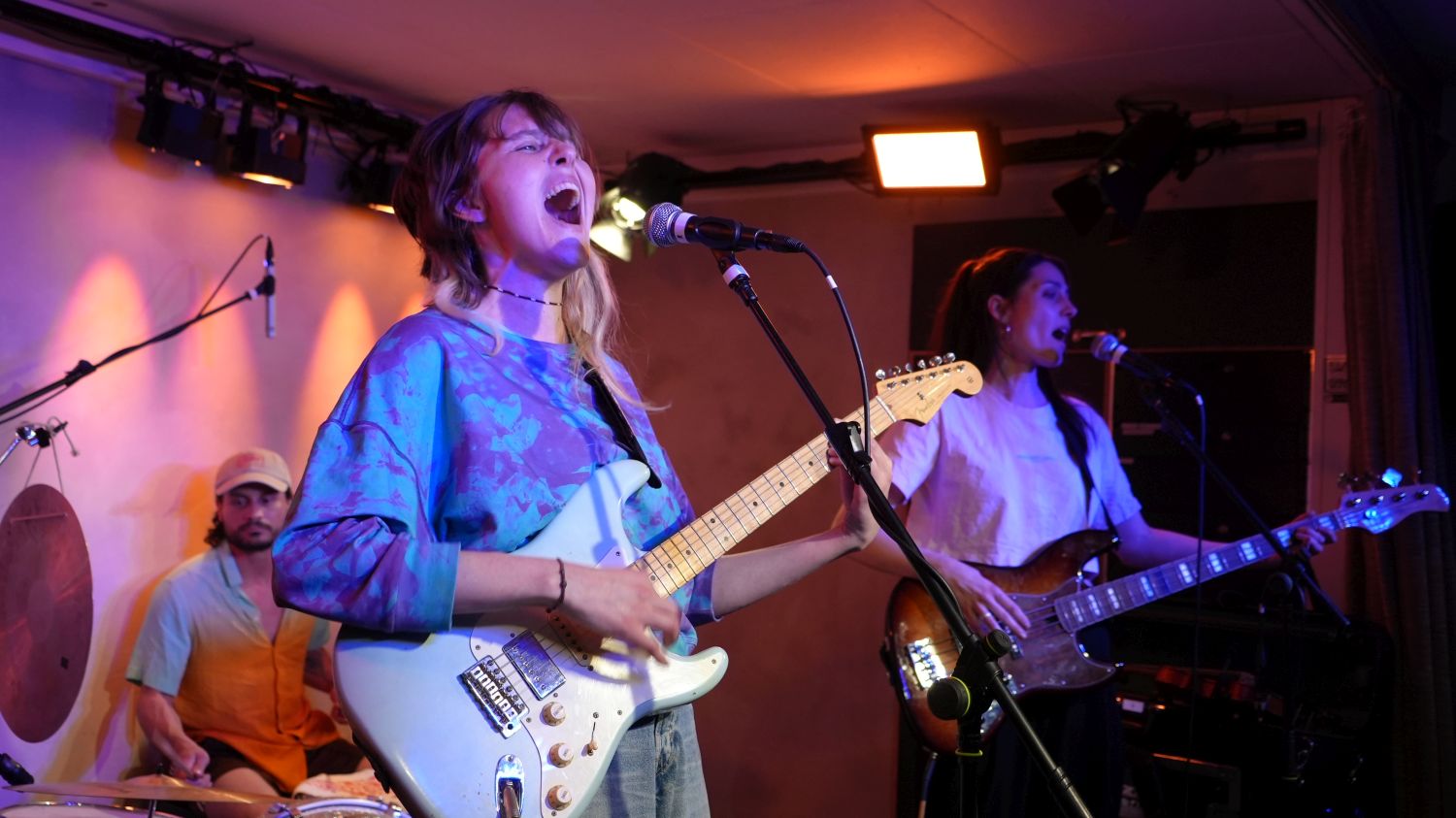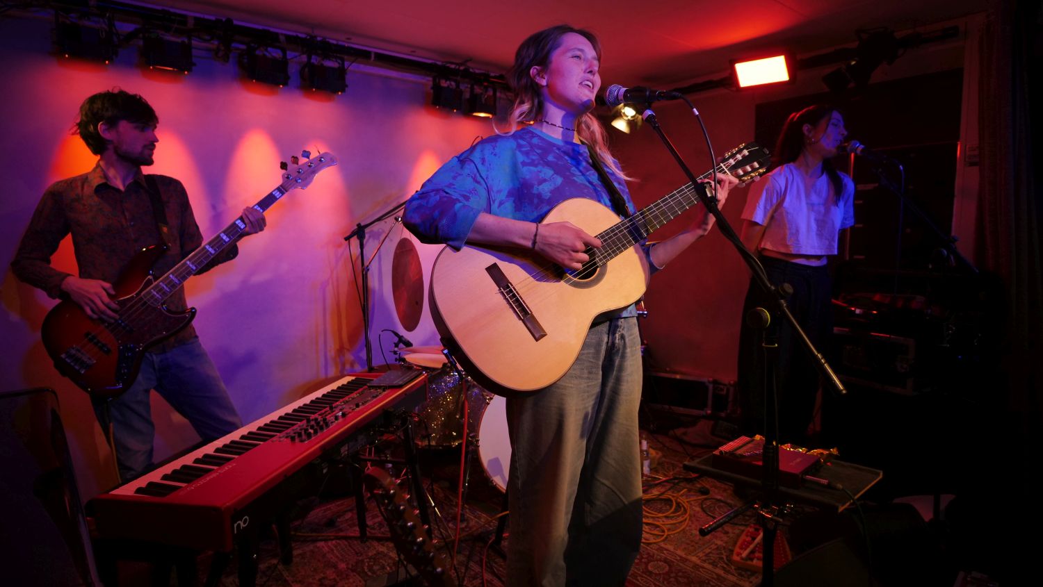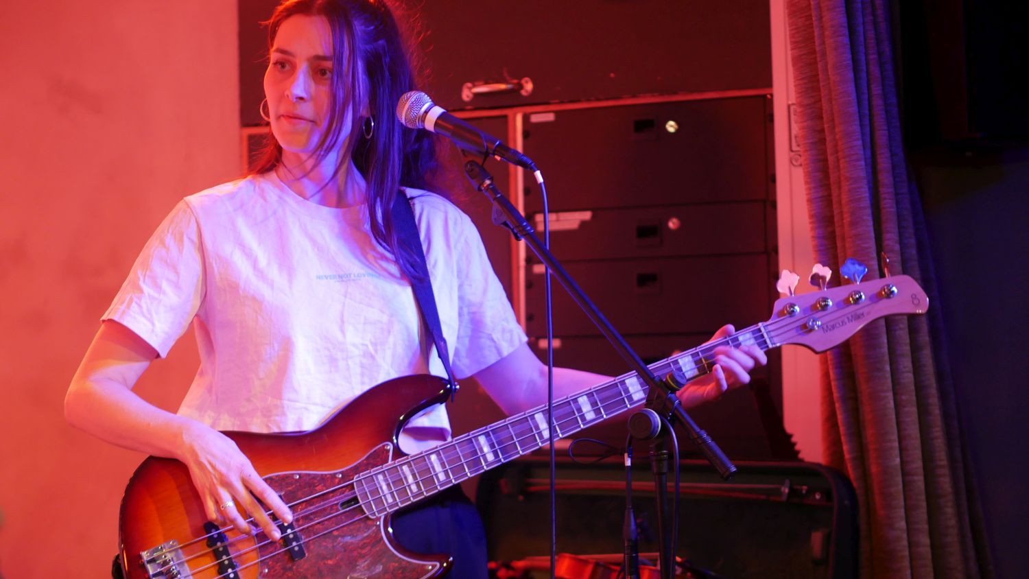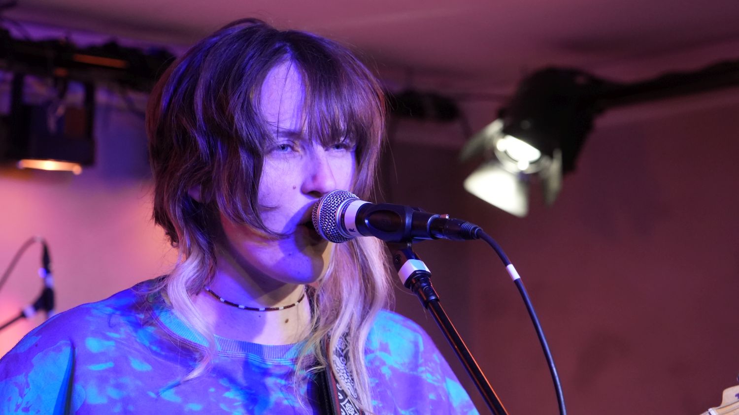 Das letzte Mal, als die Rosa Hoelger Bande (also neben Rosa selbst Judith Retzlik, Lewin Grosse und Tommy Schwarzbach) in Köln gewesen war, tobte noch die Pandemie, sodass sie ein Live-Konzert vor leerem Raum spielen musste. Das war zum Glück bei der Show in der Kölner Wohngemeinschaft, bei der Rosa & Co. ihre erste „richtige“ Banden-LP „Fuer immer Gummistiefel“ abfeierten, dann doch etwas anders. Die eigentlich entstuhlte Wohngemeinschaft war nämlich so gut gefüllt, dass die hinten im Raum stehenden Zuschauer darauf drängten, dass sich die weiter vorne stehenden hinsetzen sollten, damit sie auch etwas sehen konnten. „Wir arbeiten hier mit drei Verwarnungen“, meinte Rosa, bis sich dann auch die letzten Zuschauer, die noch vor der Bühne gestanden hatten, auf dem Boden Platz nahmen.