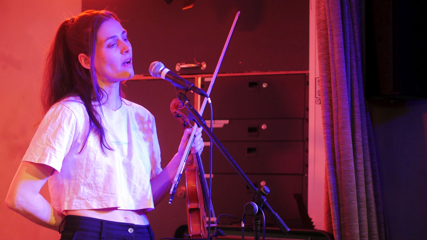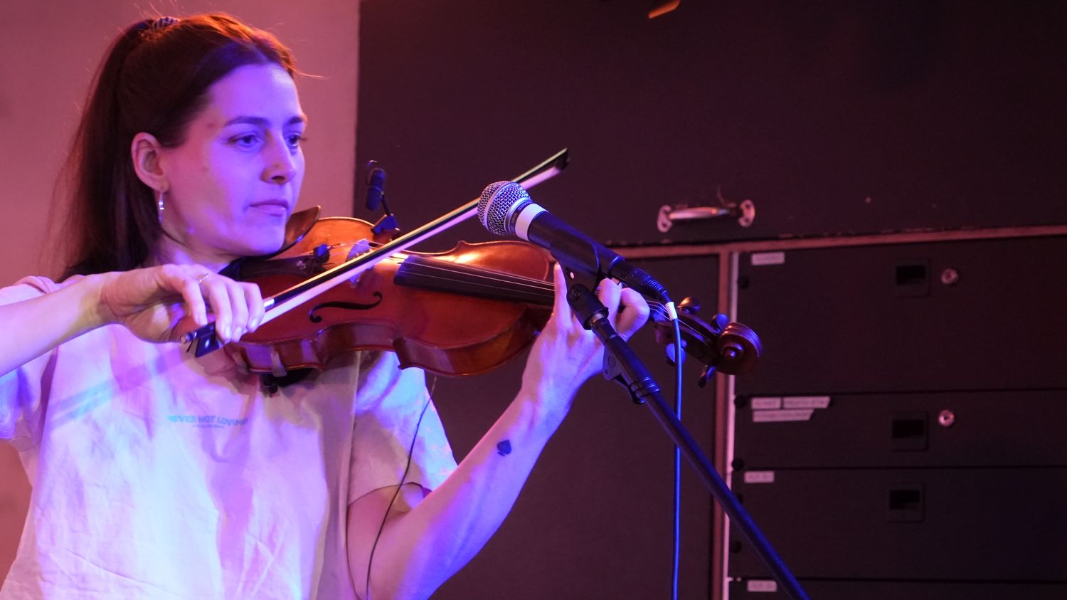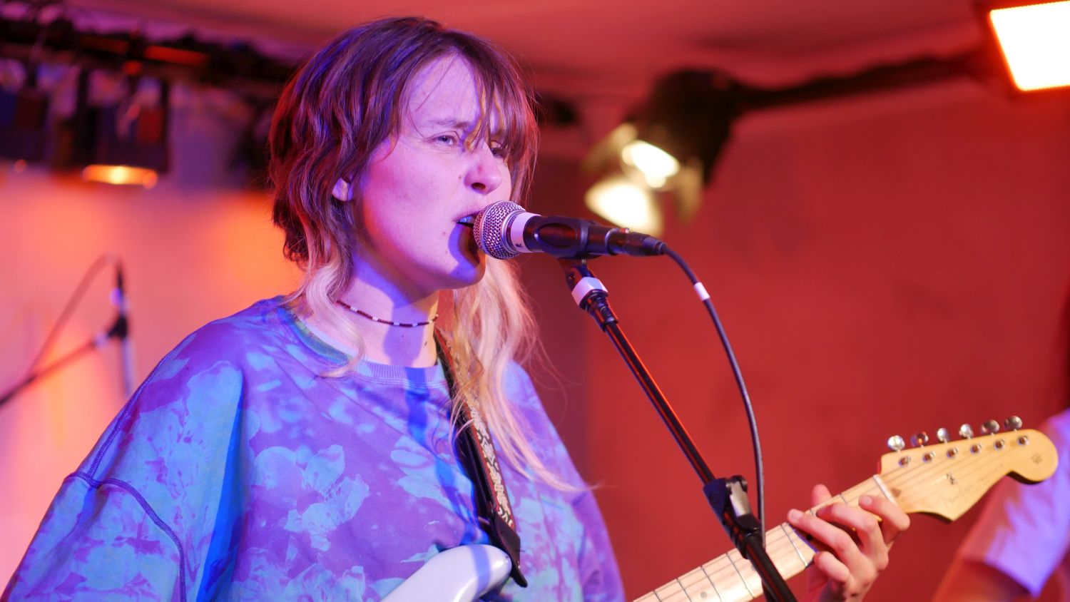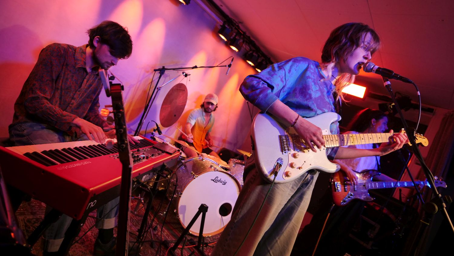 Das letzte Mal, als die Rosa Hoelger Bande (also neben Rosa selbst Judith Retzlik, Lewin Grosse und Tommy Schwarzbach) in Köln gewesen war, tobte noch die Pandemie, sodass sie ein Live-Konzert vor leerem Raum spielen musste. Das war zum Glück bei der Show in der Kölner Wohngemeinschaft, bei der Rosa & Co. ihre erste „richtige“ Banden-LP „Fuer immer Gummistiefel“ abfeierten, dann doch etwas anders. Die eigentlich entstuhlte Wohngemeinschaft war nämlich so gut gefüllt, dass die hinten im Raum stehenden Zuschauer darauf drängten, dass sich die weiter vorne stehenden hinsetzen sollten, damit sie auch etwas sehen konnten. „Wir arbeiten hier mit drei Verwarnungen“, meinte Rosa, bis sich dann auch die letzten Zuschauer, die noch vor der Bühne gestanden hatten, auf dem Boden Platz nahmen.