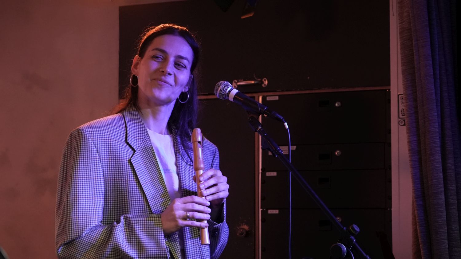 Logischerweise wurden die Songs aber nicht einfach so hingenudelt, sondern liebevoll umspielt, getweakt, geformt und somit auch ganz anders ausgeführt, als auf den Tonträgern. Das fing dann an mit der Elegie von der „Guten Seele“ (die mit einem sehnsüchtigen Seufzer vom Publikum begrüßt wurde) und die hier mit Band-Unterstützung gegeben wurde und endete noch lange nicht, als Rosa ganz zum Schluss dann auch endlich den Song „Winter in Spechte“ spielte – nach dem Ungeduldige schon lange gefragt hatten. Zwischendurch gab es dann immer wieder Eskapaden, als sich die Musiker an den Instrumenten abwechselten – und allzuoft die Bassistin/Geigerin/Sängerin Judith Retzlik zum Ziel von musikalischen Späßen wurde – etwa als sie von Rosa bei der mit Schmackes gegebenen Indie-Pop-Nummer „Romantik zu Kitsch“ gebeten wurde, ein (übrigens brillantes) klassisches Geigensolo zu spielen und später – weil sie ja auch Trompete spiele, diese aber nicht dabei habe, bei dem eigenartigen Spoken-Word Elaborat „Wow, du bist ein Mensch mit Ambitionen“ stattdessen zur Blockflöte griff.