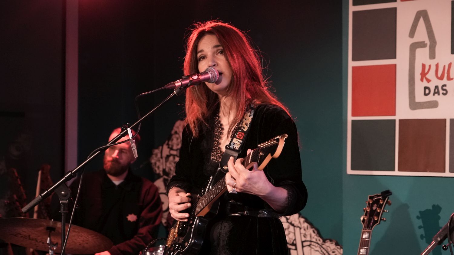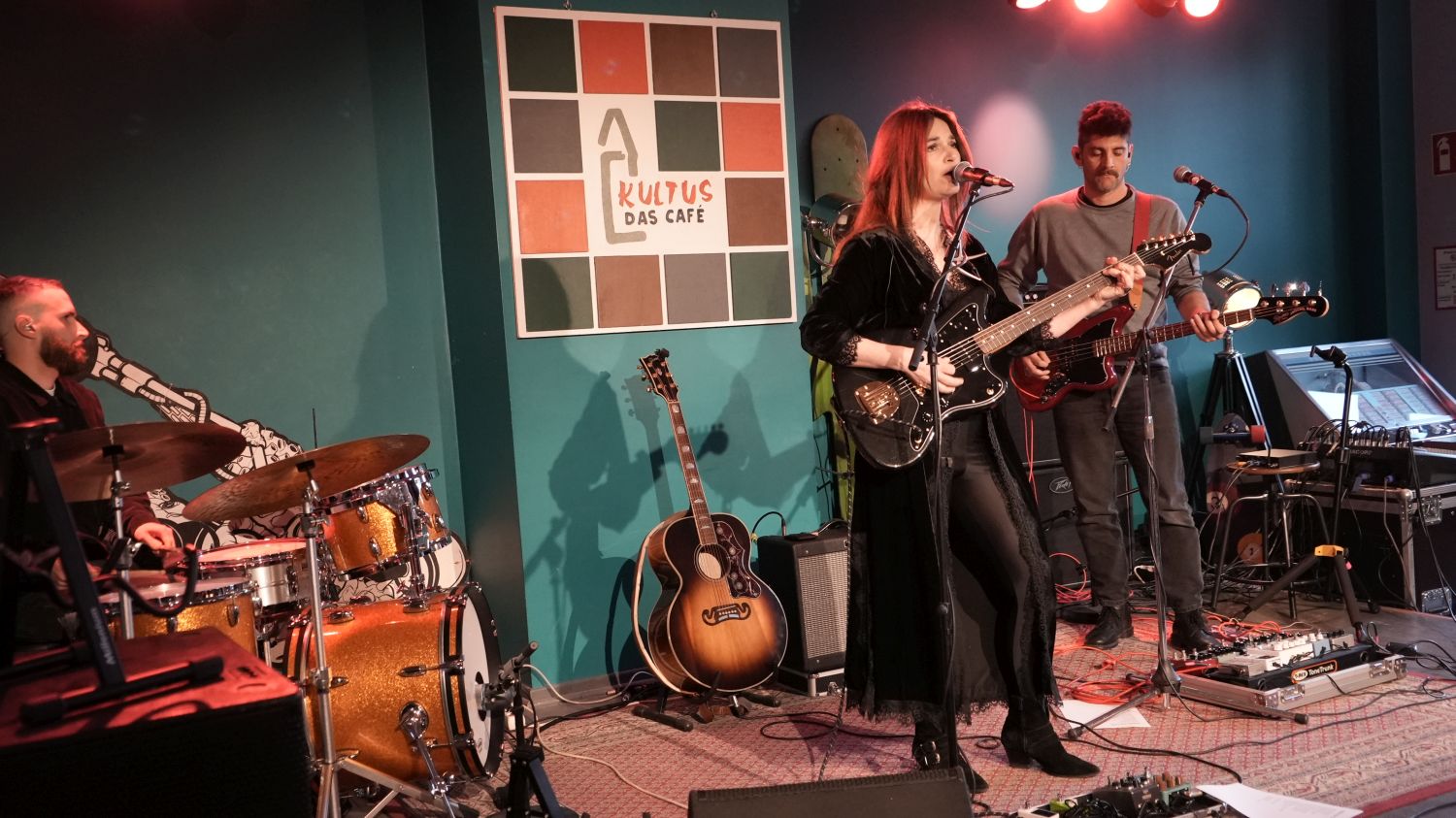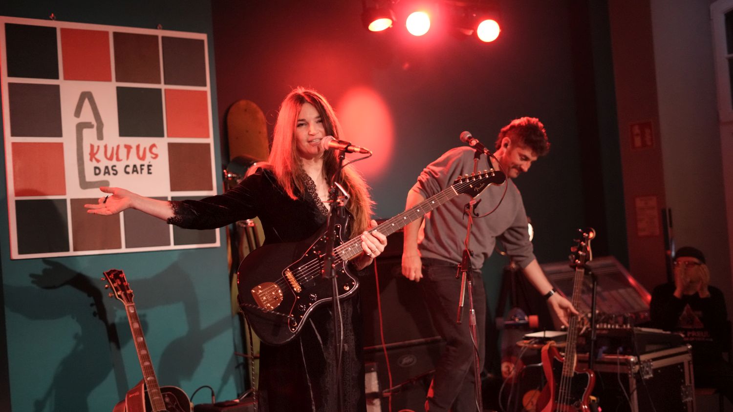 Also, um ehrlich zu sein, liegt das Grevenbroicher Café Kultus eher in der Mitte, als am Rand der Stadt, und richtig dunkel war es auch noch nicht, als die italienische Songwriterin Charlie Risso mit ihrem Gitarristen Robin Manzini und dem neuen Drummer Davide Chiogga die Bühne betrat – aber thematisch passt der Titel dieser Story dann doch zu der Show, denn zumindest in der Musik von Charlie Risso wird es niemals so richtig hell. (Die EP „The Light“ von 2022 muss wohl ein Versehen gewesen sein.)