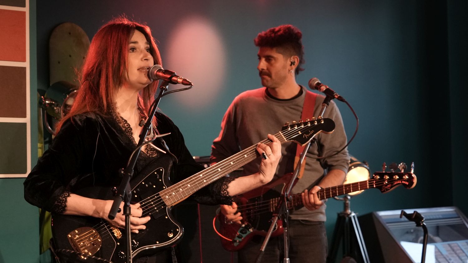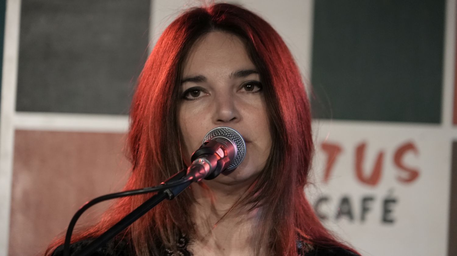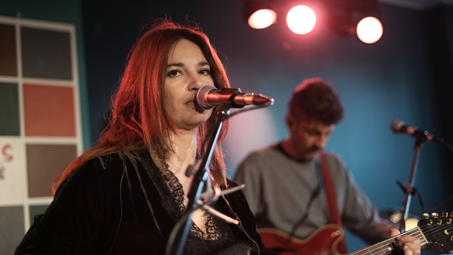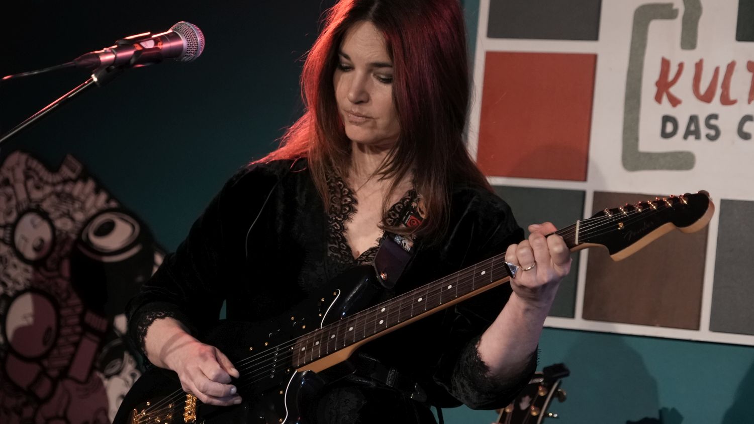 Also, um ehrlich zu sein, liegt das Grevenbroicher Café Kultus eher in der Mitte, als am Rand der Stadt, und richtig dunkel war es auch noch nicht, als die italienische Songwriterin Charlie Risso mit ihrem Gitarristen Robin Manzini und dem neuen Drummer Davide Chiogga die Bühne betrat – aber thematisch passt der Titel dieser Story dann doch zu der Show, denn zumindest in der Musik von Charlie Risso wird es niemals so richtig hell. (Die EP „The Light“ von 2022 muss wohl ein Versehen gewesen sein.)